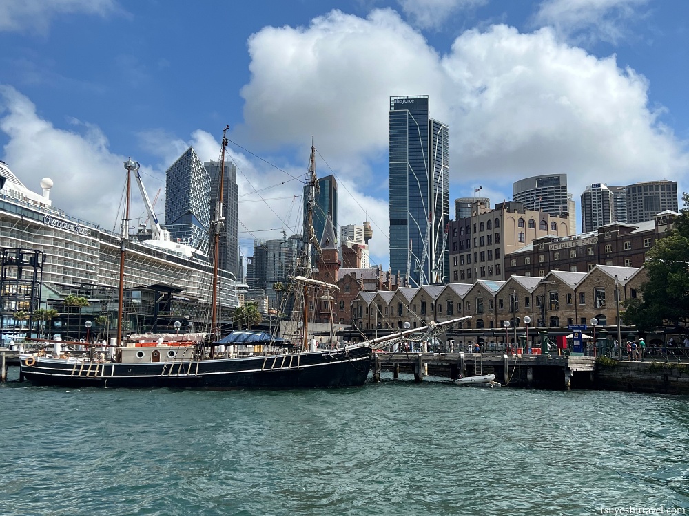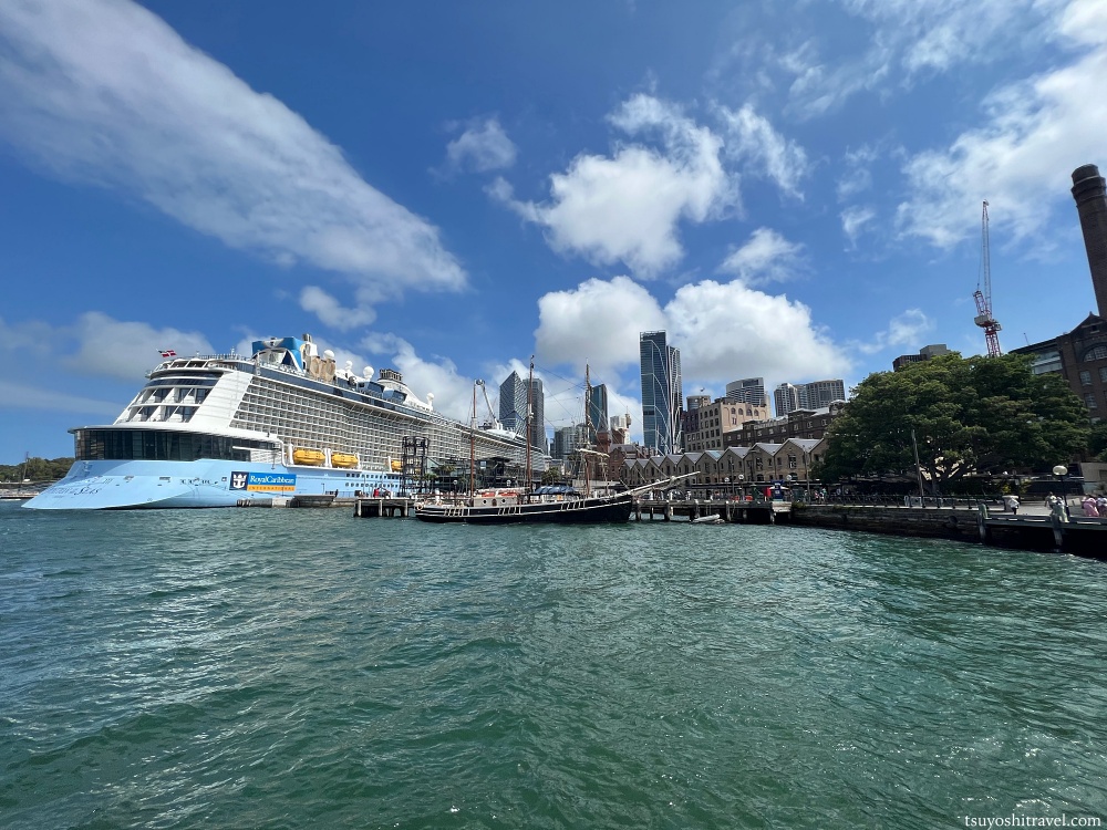 豪華客船の奥には、高層ビル群が立ち並ぶシティがあり、その手前にはロックスの街並みまで見ることができます。