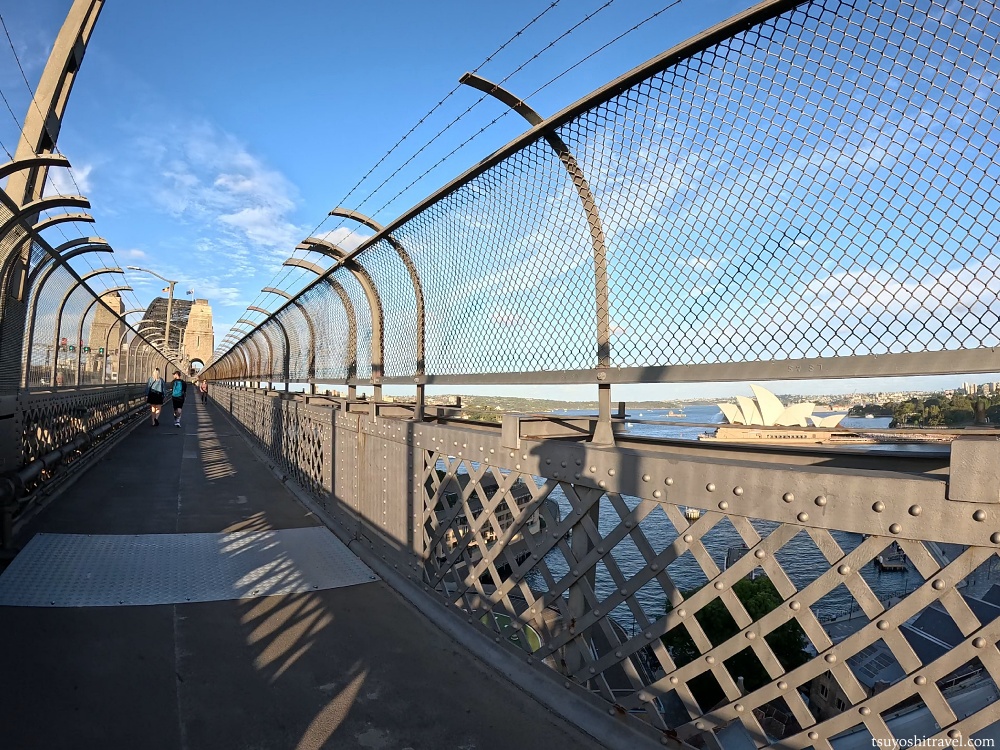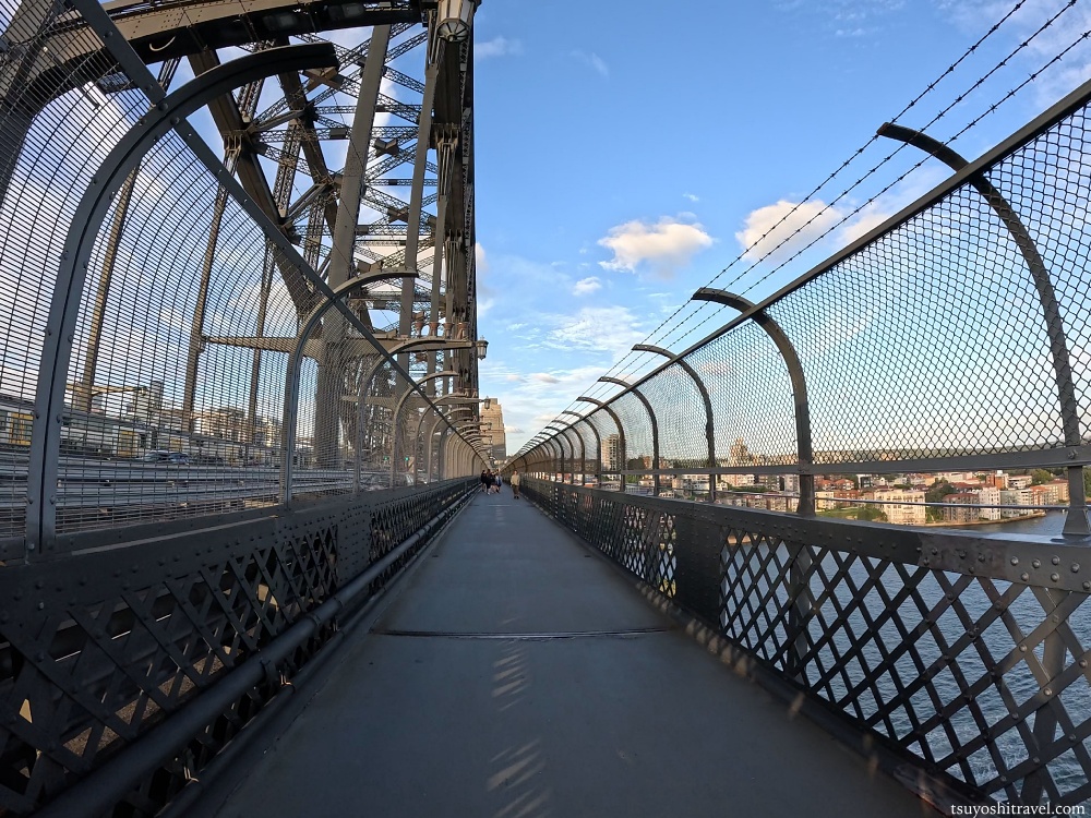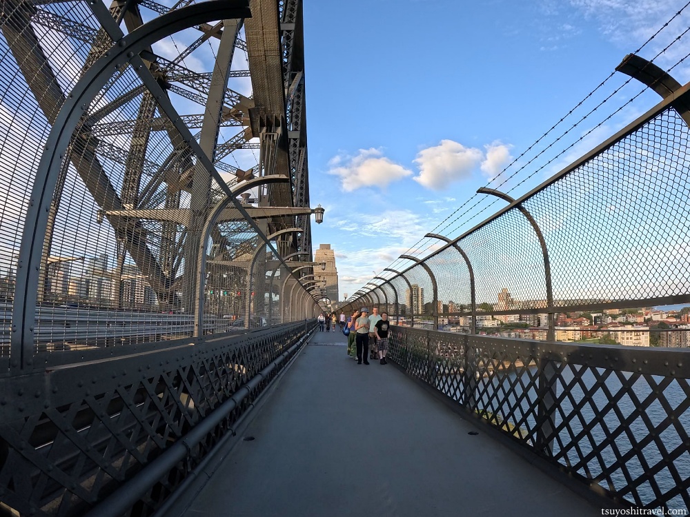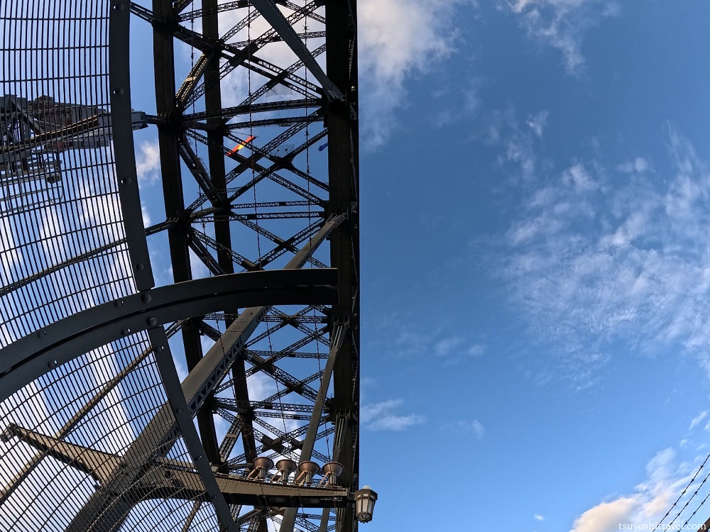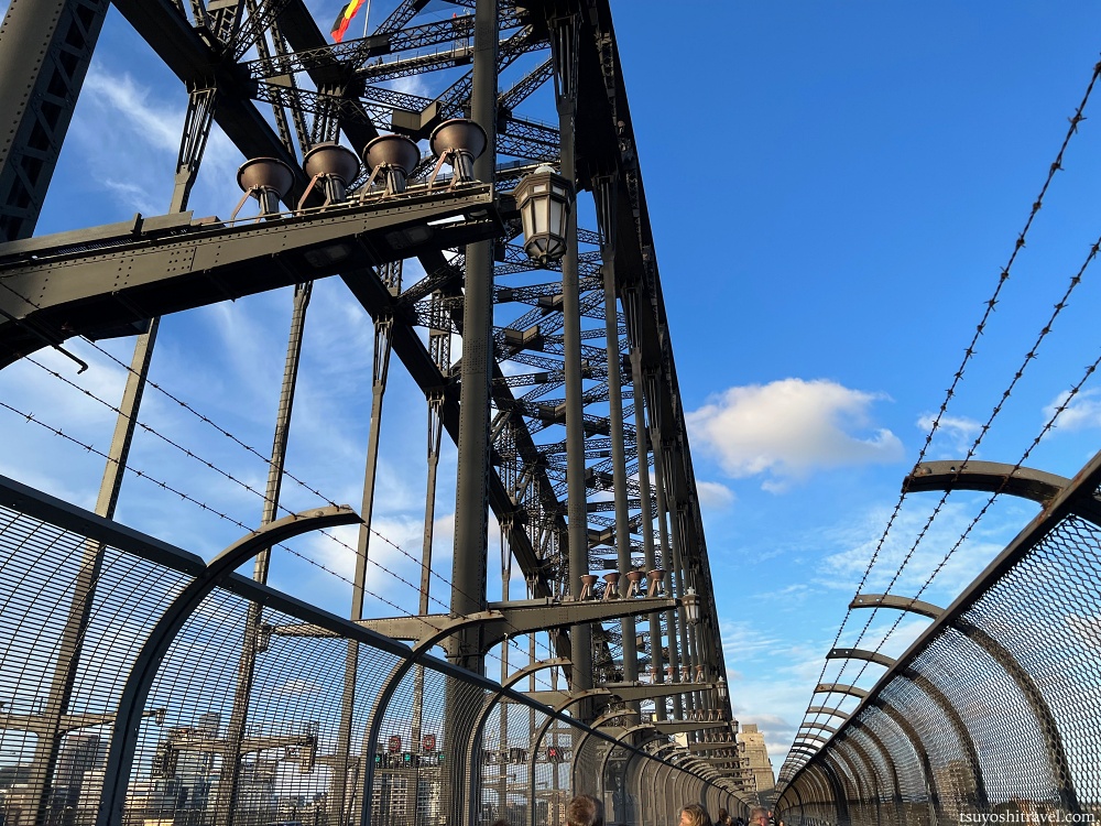 ブリッジクライムと言って、命綱をつけてハーバーブリッジの上に登るアトラクションがありますが、あ実際に歩く場所は今見えている黒い鉄骨の部分です。