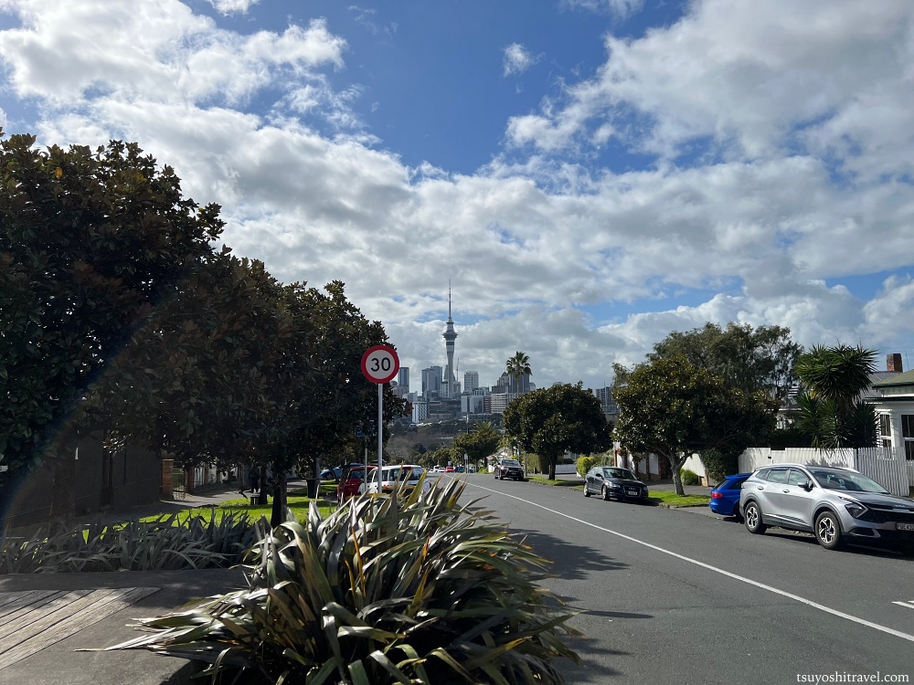 ただの高層ビル群ではなく、速度表示や路上駐車の車など、日常の生活が垣間見られる光景の中に、スカイタワーを中心にしたオークランドのダウンタウンが見れるので、なんというか、郊外と中心の対比で景色を見ることができるんですね・・・