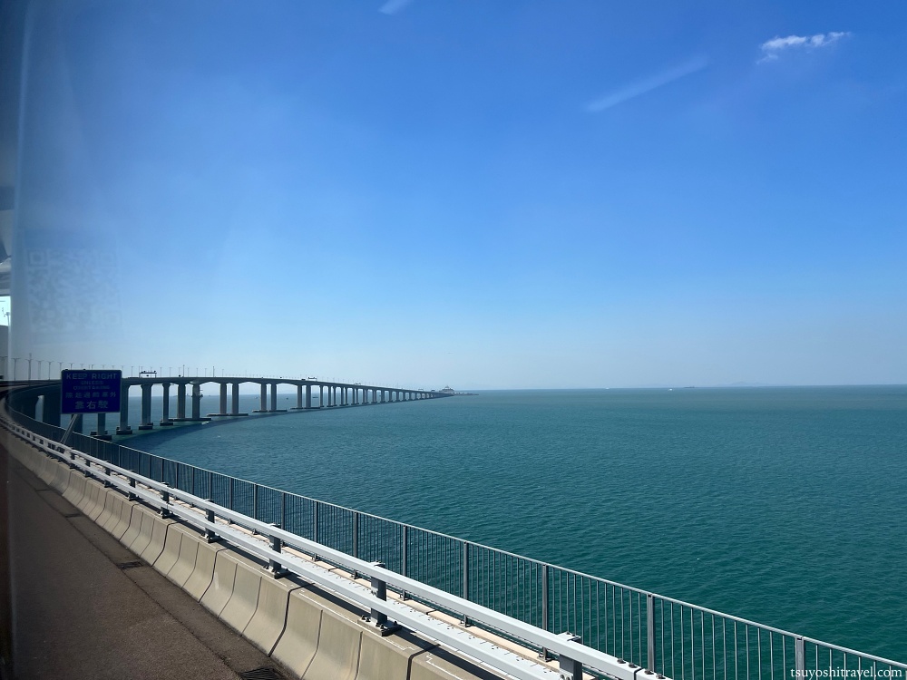 さらに進んでいくと、青空に映えるコバルトブルーの海と港珠澳大橋を見ることができた。