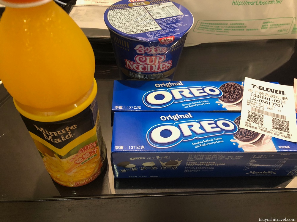 近くのセブンイレブンで調達してきたカップヌードルとオレンジジュース、そしてオレオを夜食にした。