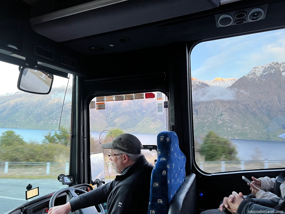ツアー参加者の多くが、クイーンズタウン市内中心部からバスに乗車しており、私の場合は市内からかなり離れたダブルツリーbyヒルトンに宿泊をしており、かつミルフォードサウンドへのバスの通り道でもあったために、途中からバスに乗ることになっていたわけです。