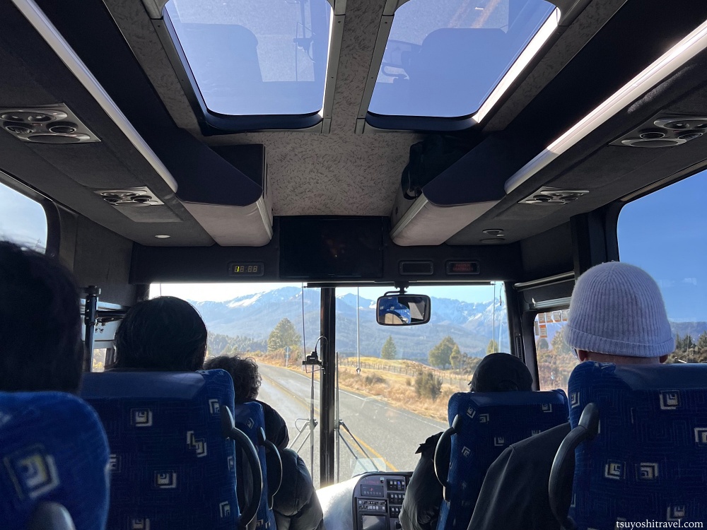 バスの車内からも、天井の窓に見上げるような高い雪化粧をした山々を望めます。