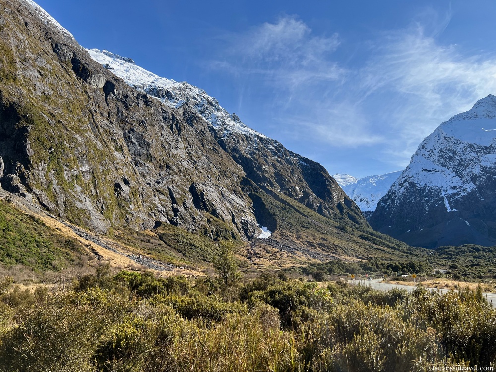 それからさらにテアナウの街を出発をすると、ミルフォードサウンドに至るまでのおよそ119kmの区間は深い山を切り開きながら進むミルフォード・ロード(Milford Road)です。