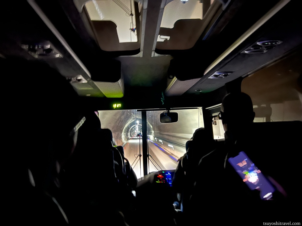 その前に、一度絶景とは離れて、薄暗いトンネルの中をバスで通って行きます。