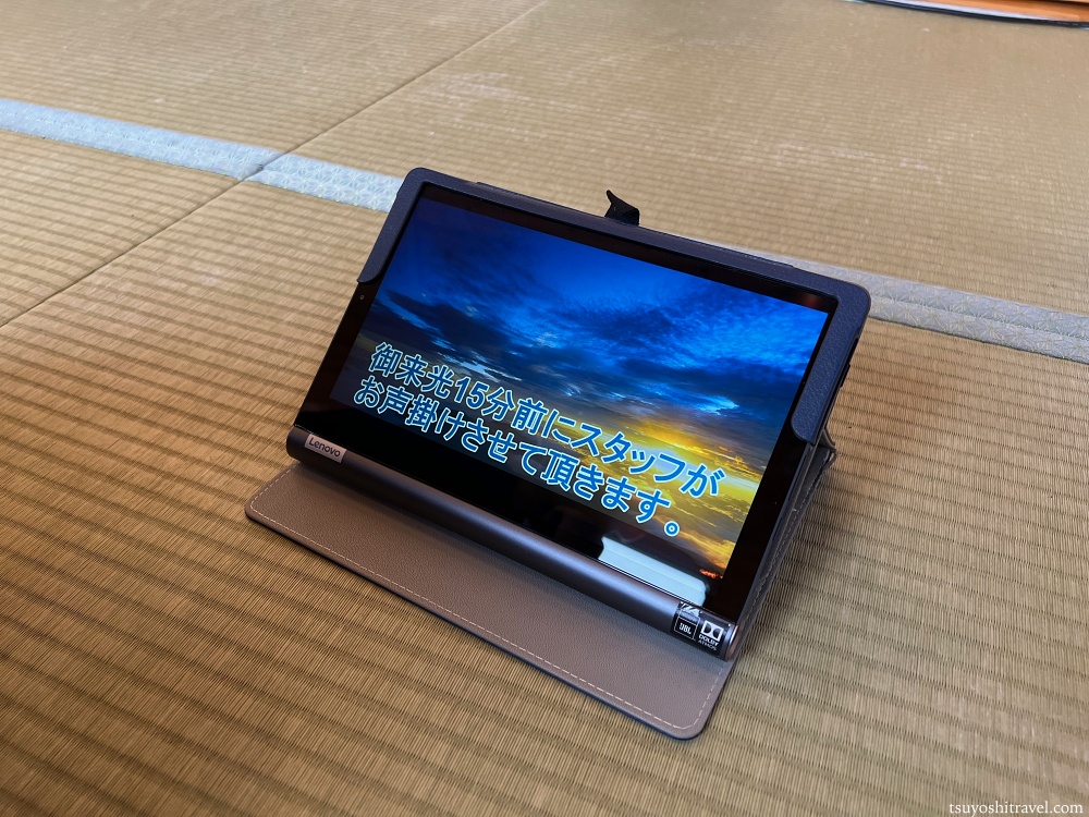 スタッフの方から、簡単な説明を受けたあとは、畳に座りタブレットで宿泊案内を見ます。