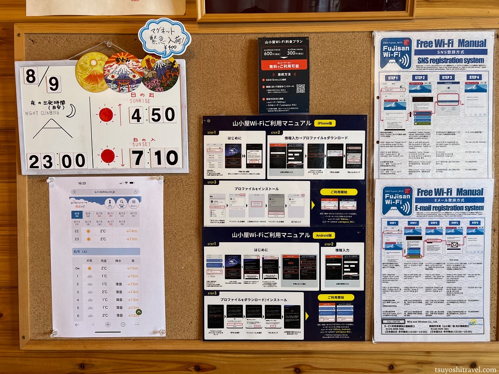 入り口には、日の入・日の出時刻が書かれたボードや、明日の天気が表示された紙がありました。
