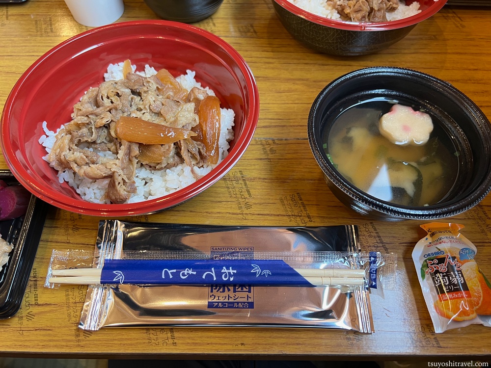 富士山の上で食べる、牛丼、お味噌汁、副菜(シュウマイ、サラダなど)の定食は本当に美味しかったです。