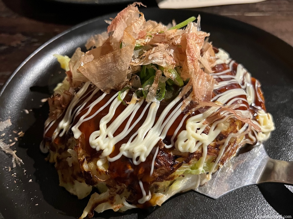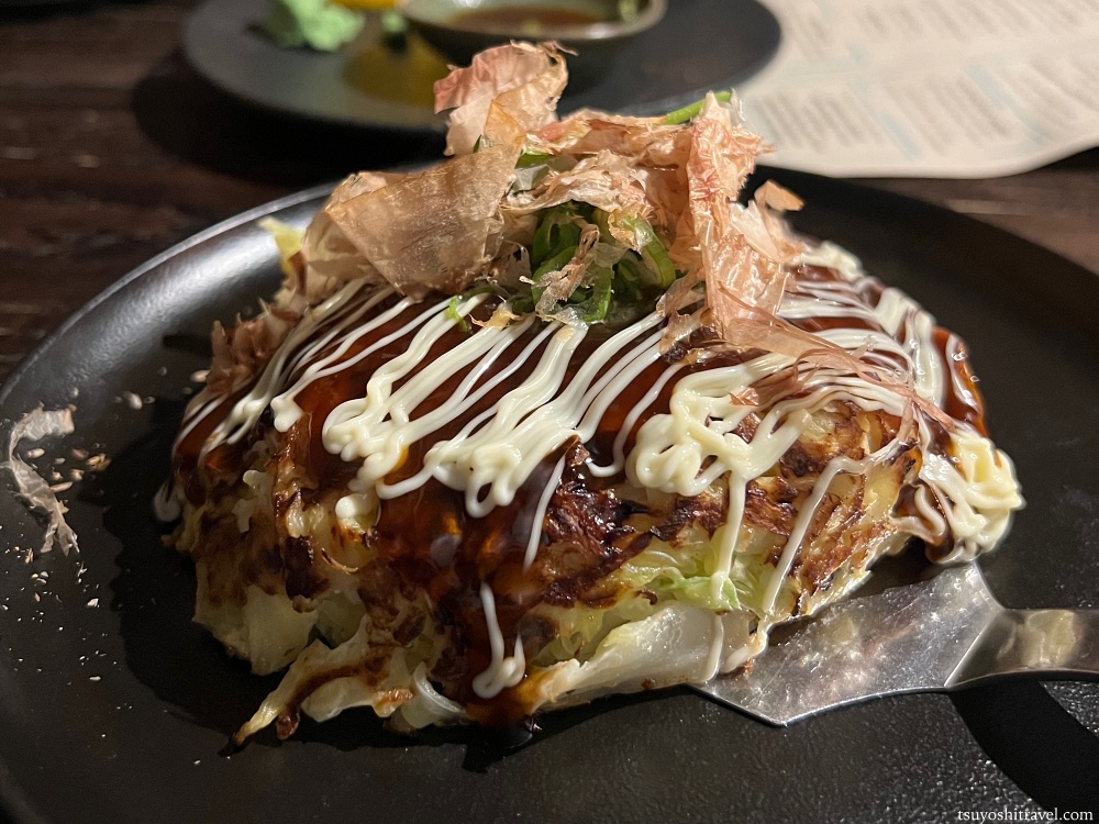 ラーメンや、お好み焼き、餃子、焼きそば、海鮮丼などさまざまなメニューを取り揃えるこのお店ですが、私がチョイスしたのは大阪風お好み焼きです。