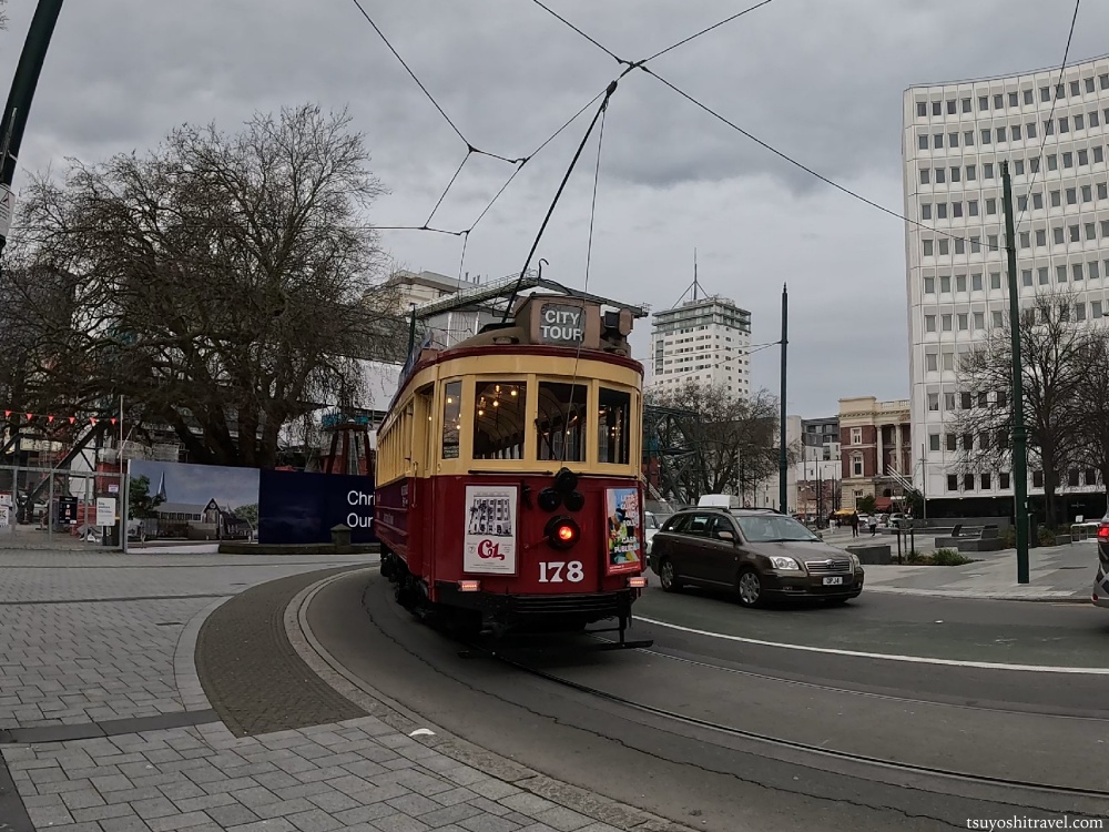 カセドラル・スクエア付近で散歩をしていると、ちょうどカラフルな色が特徴のクライストチャーチトラムが走ってきました。