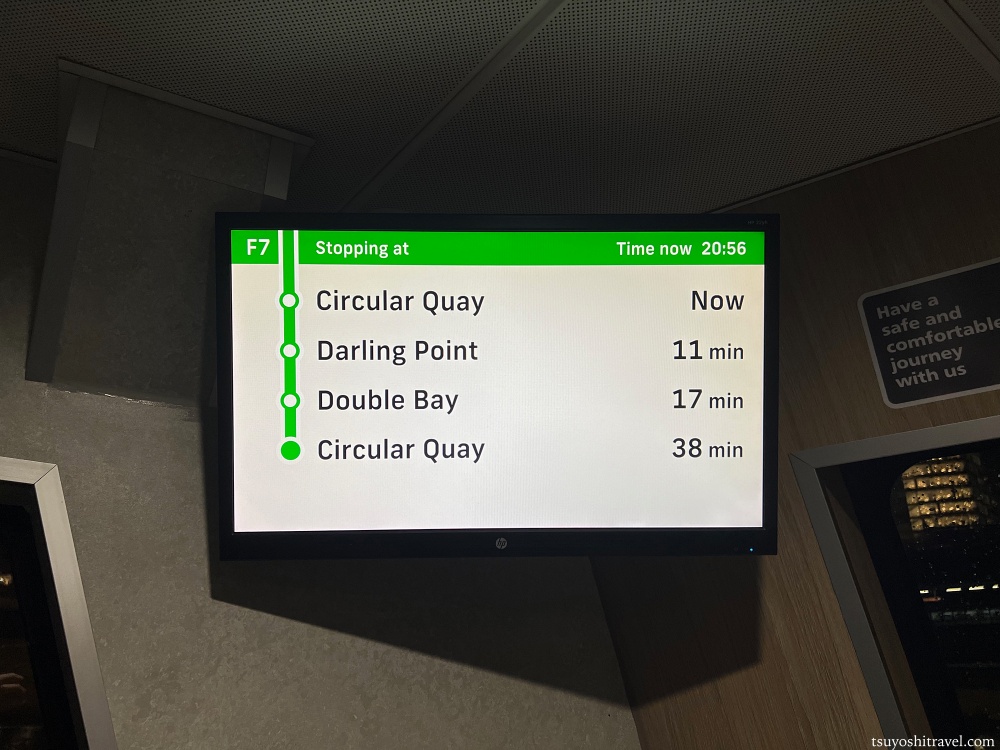 フェリーは、サーキュラーキー(Circular Quay)を出発したあと、ダーリングポイント(Darling Point)、ダブルベイ(Double Bay)と進み、再びサーキュラーキーに折り返して戻ってくるようなので、そのまま40分近い船旅をしてみようと思います。
