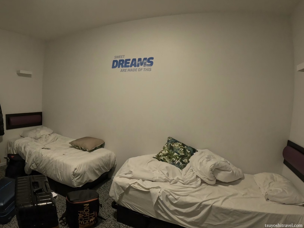 部屋の中は、箱にただベッドを置いただけのような作りで非常に質素です。