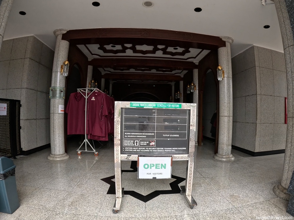 私は、デング熱対策も兼ねて、東南アジアを旅する時には、どんなに暑くても長袖長ズボンを着用しているので、そのままモスク内に入ることができました。