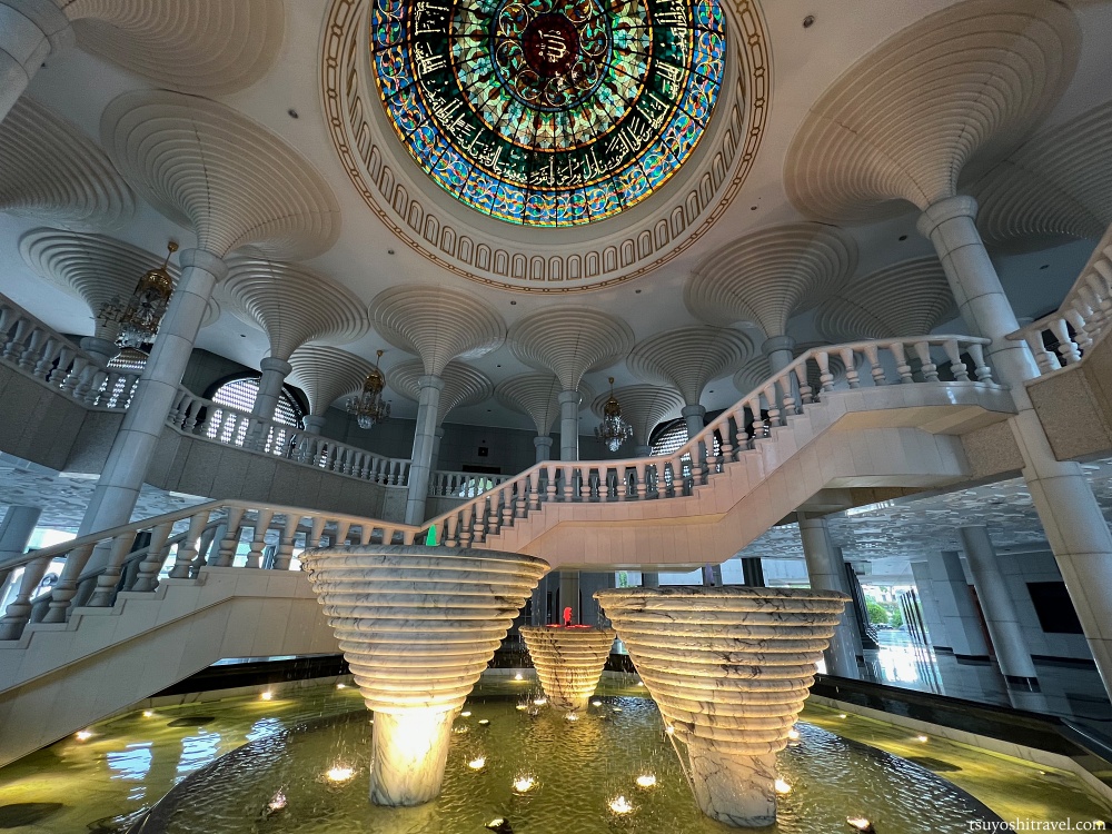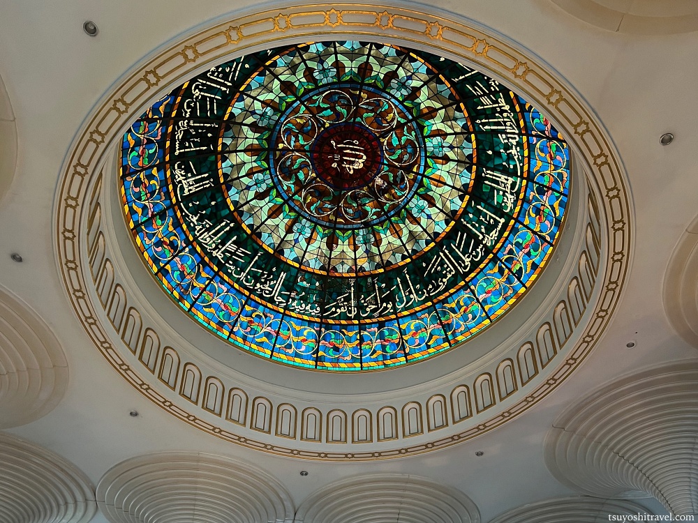 モスク内部へと繋がる階段と天井のステンドグラスです。