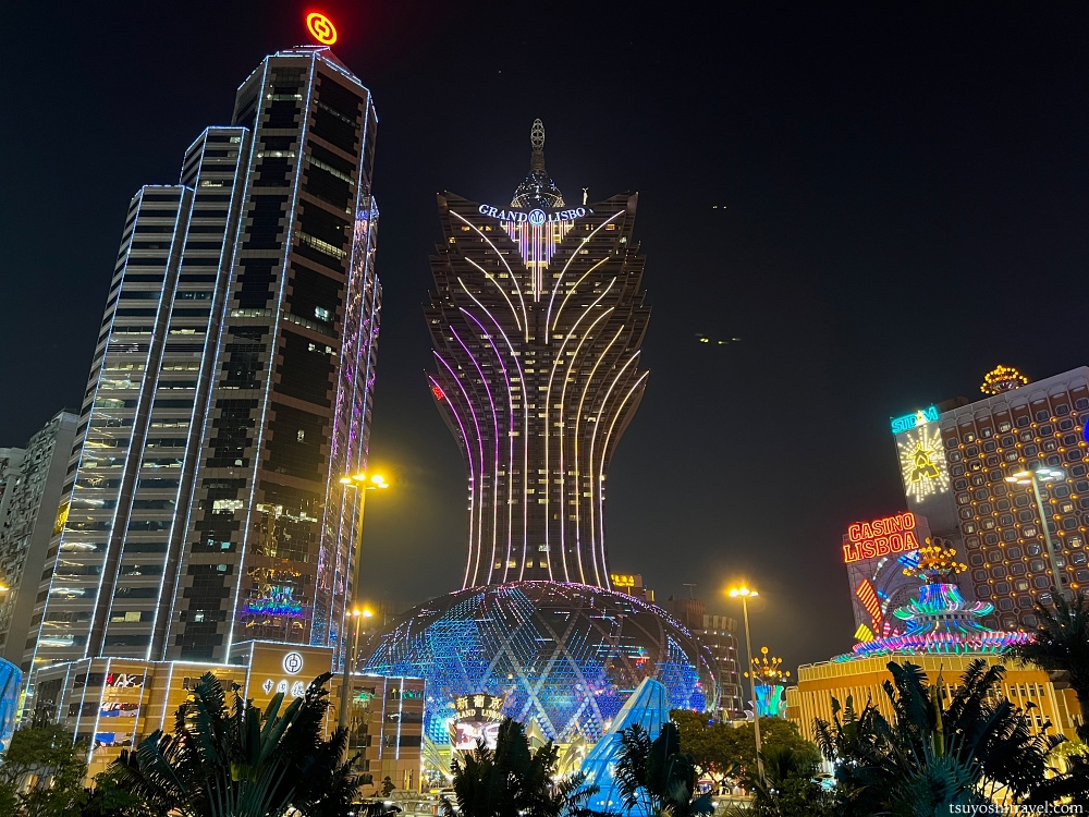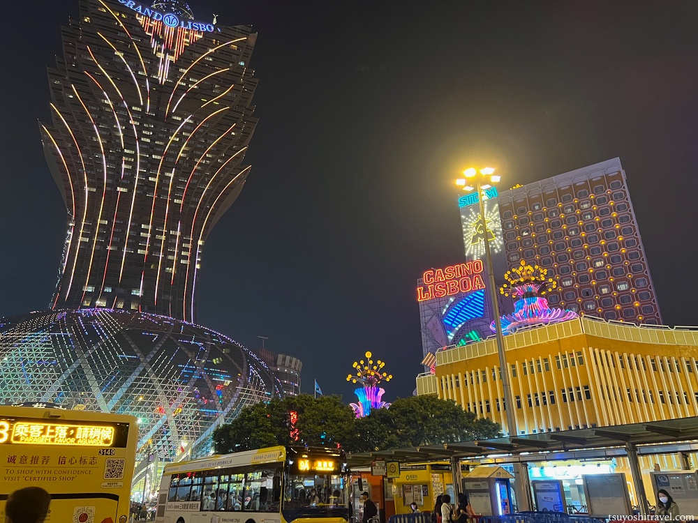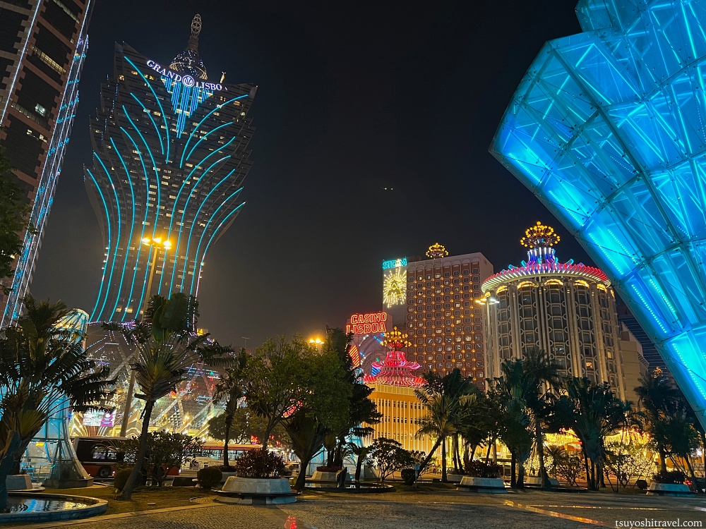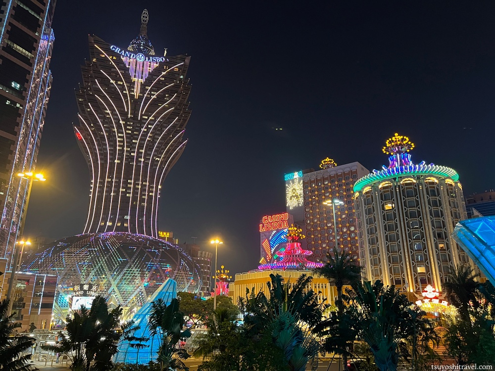 写真左のカジノリスボア周辺には数多くのカジノ施設が林立しており異世界の雰囲気を放っている。