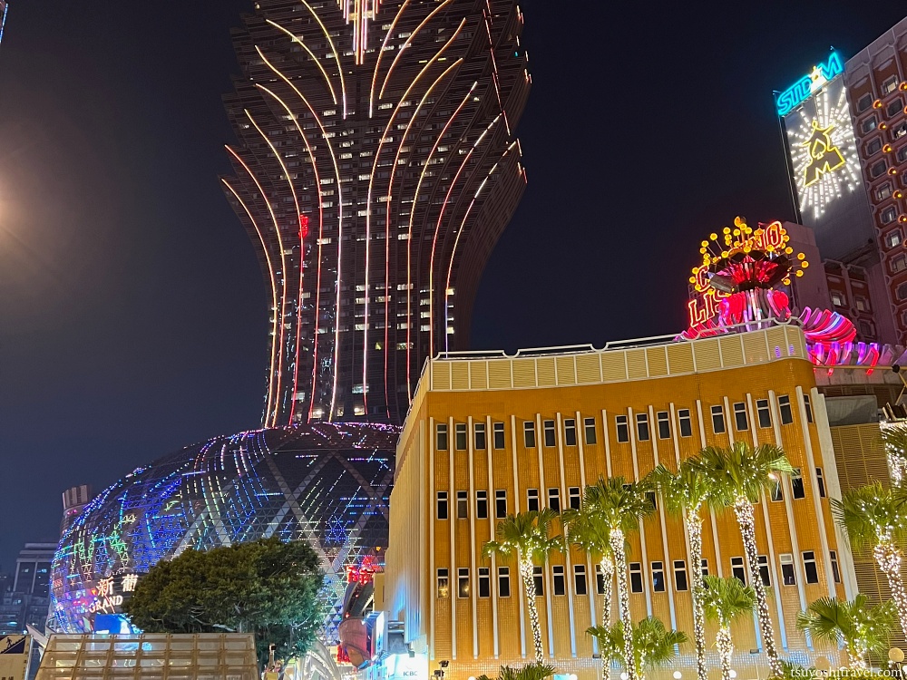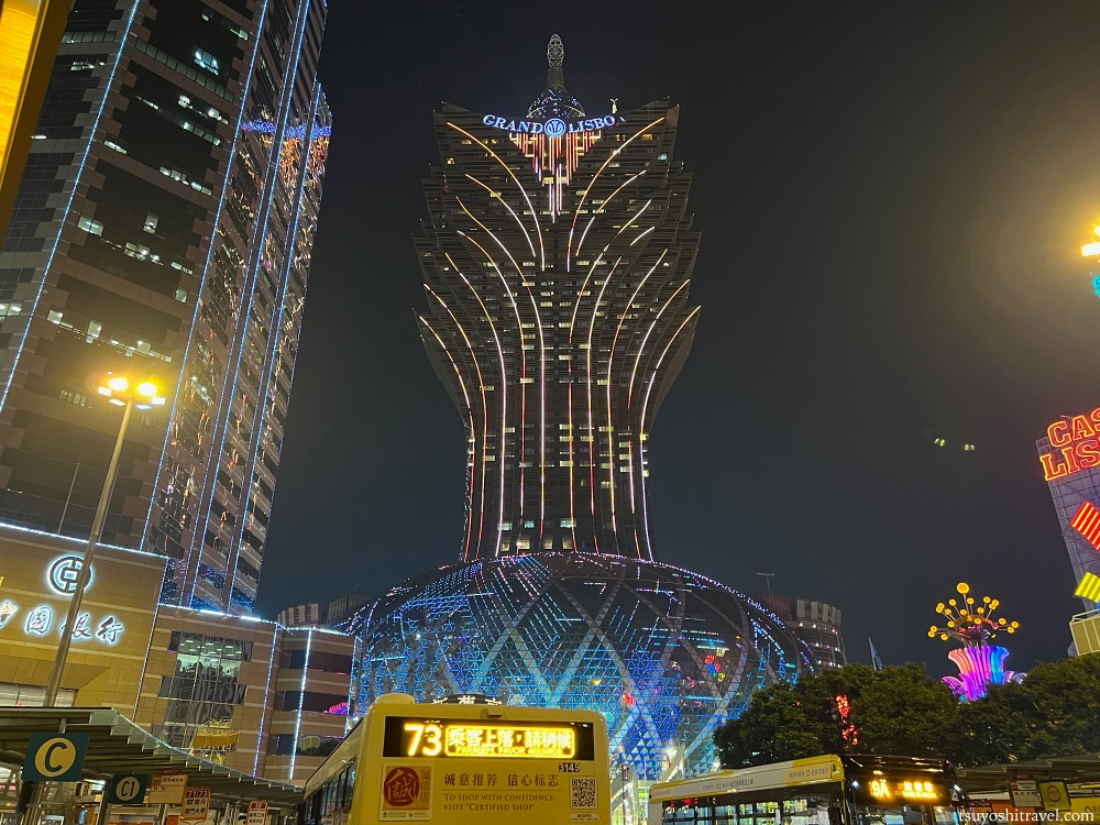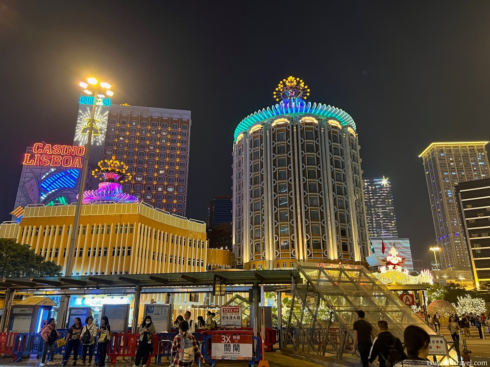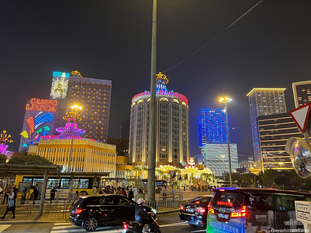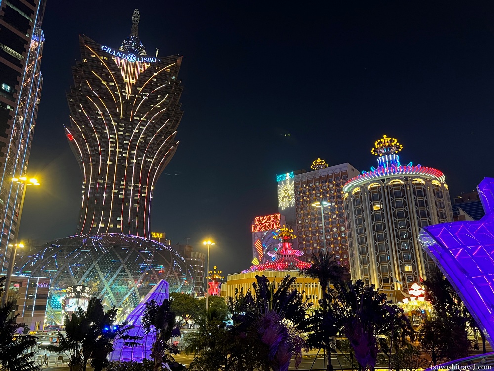 写真左のカジノリスボア周辺には数多くのカジノ施設が林立しており異世界の雰囲気を放っている。