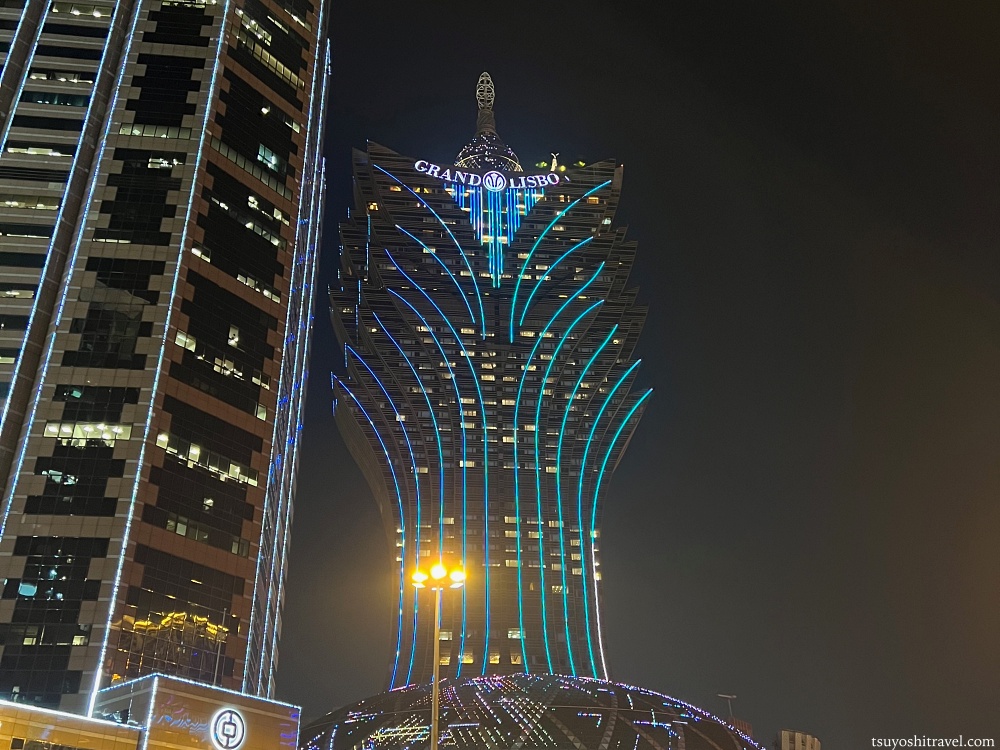 近くで見てみるとかなりの高さがあるが、実はこちらの建物が「グランドリスボアカジノ(新葡京)」というカジノ併設型の高級ホテルである。