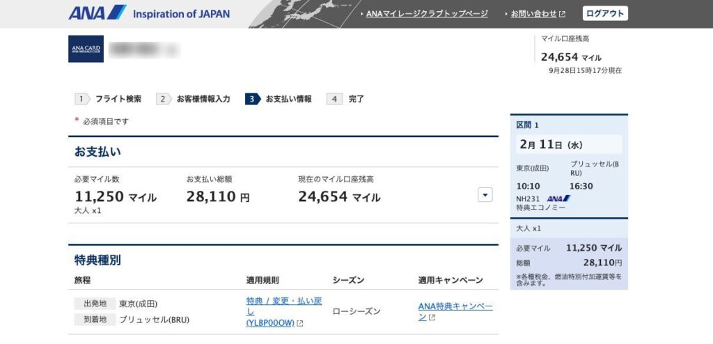 | 飛行機(ANA) | 成田→ブリュッセル エコノミークラス特典航空券 | 11,250マイル+28,110円 |