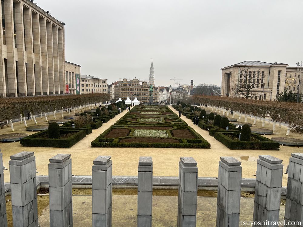 芸術の丘(モン・デ・ザール) 高台に位置するこの場所からは、手入れの行き届いた幾何学模様の庭園越しにブリュッセルの街並みを一望でき、天気が良ければ遠くに市庁舎の塔まで見渡せる絶好のフォトスポットです。でも残念ながらこの日は雨でした。天気には逆らえませんので。