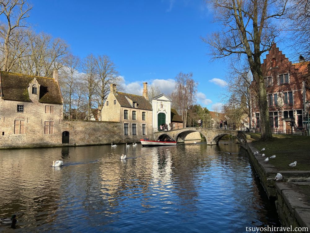 愛の湖公園(ミンネワーテル) 運河の入り口に広がる静かな公園で、たくさんの白鳥が優雅に泳ぐ姿は、ブルージュが「おとぎ話の街」と呼ばれる理由を象徴するような穏やかな景色でした。