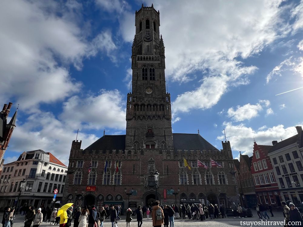 マルクト広場と鐘楼 街のシンボルである高さ83メートルの鐘楼がそびえ立つ広場で、周囲を囲むカラフルなギルドハウスとのコントラストは、まさにベルギー観光のハイライトと言える絶景です。