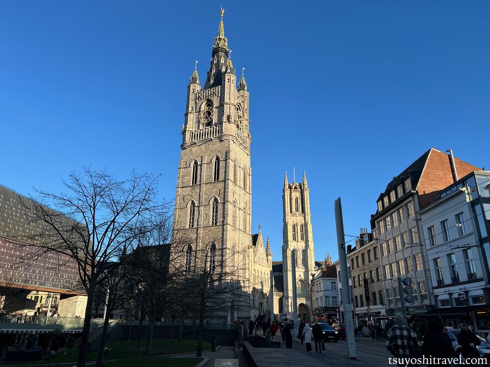 ゲントの鐘楼 街のシンボルとして高くそびえ立つこの塔は、周囲の歴史的な街並みを見守るような圧倒的な存在感を放っており、ゲントがかつて誇った繁栄を象徴していました。