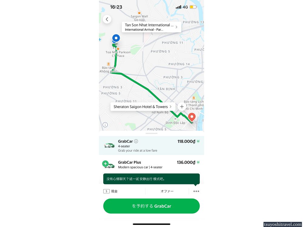 ちなみにGrabのアプリ上では空港から市内にあるホテルまでは118,000ドン=705円程度で行くことができると書いてある。