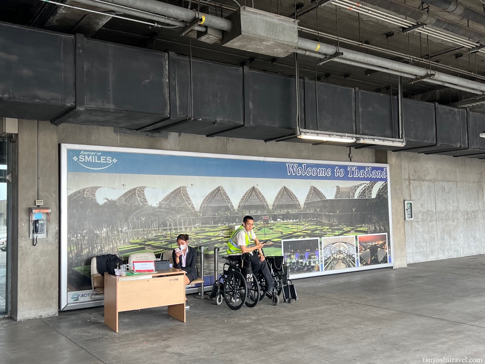 タイへようこそスワンナプーム空港へようこそといった看板が並んでいる。