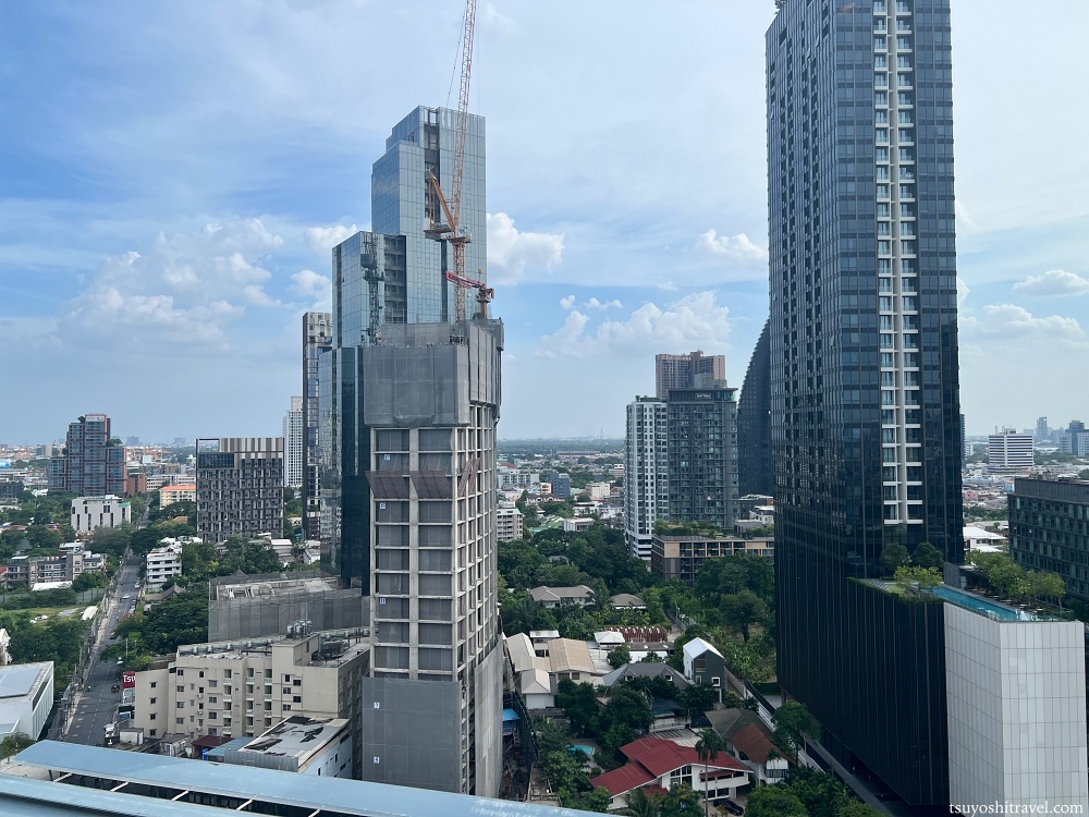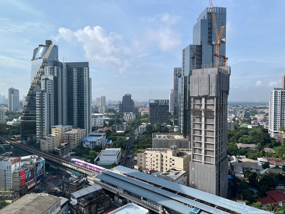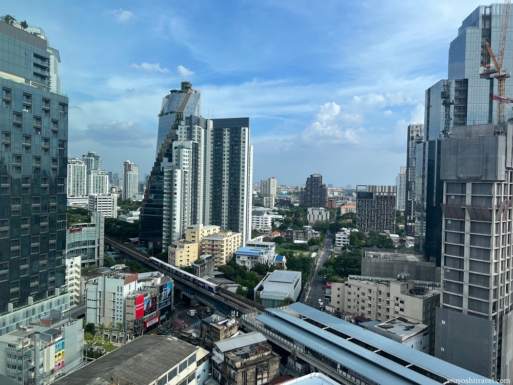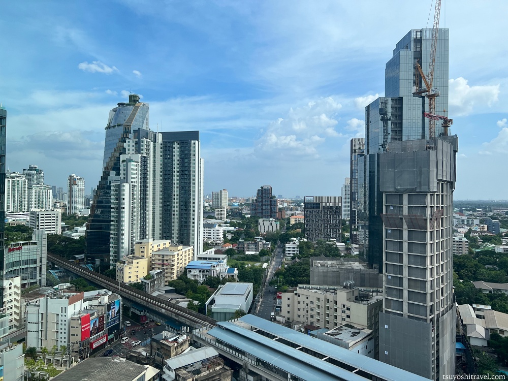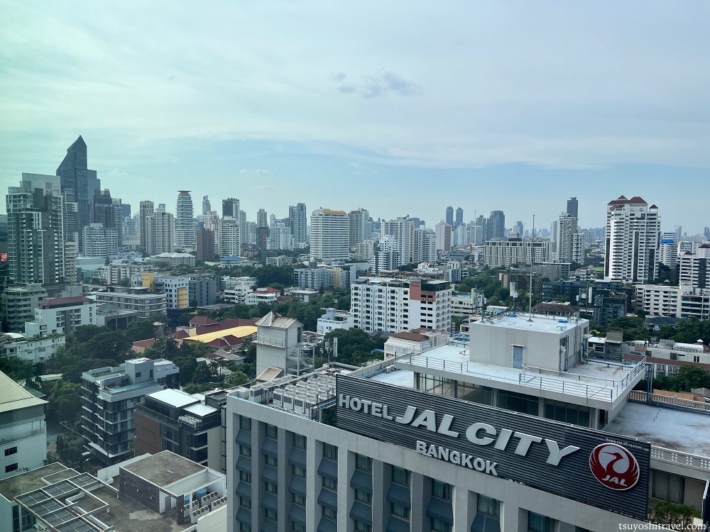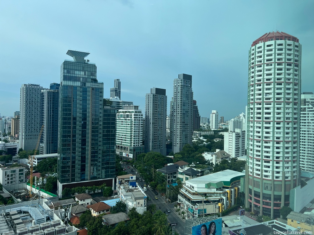 客室の窓から周辺のバンコクの街の様子を望む