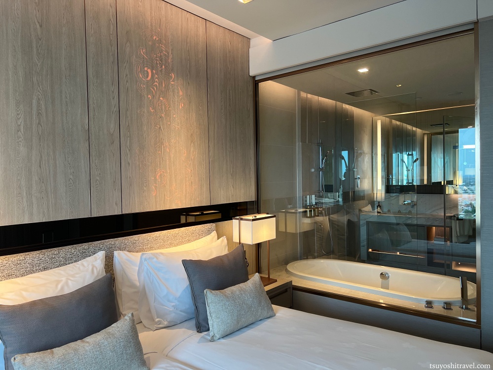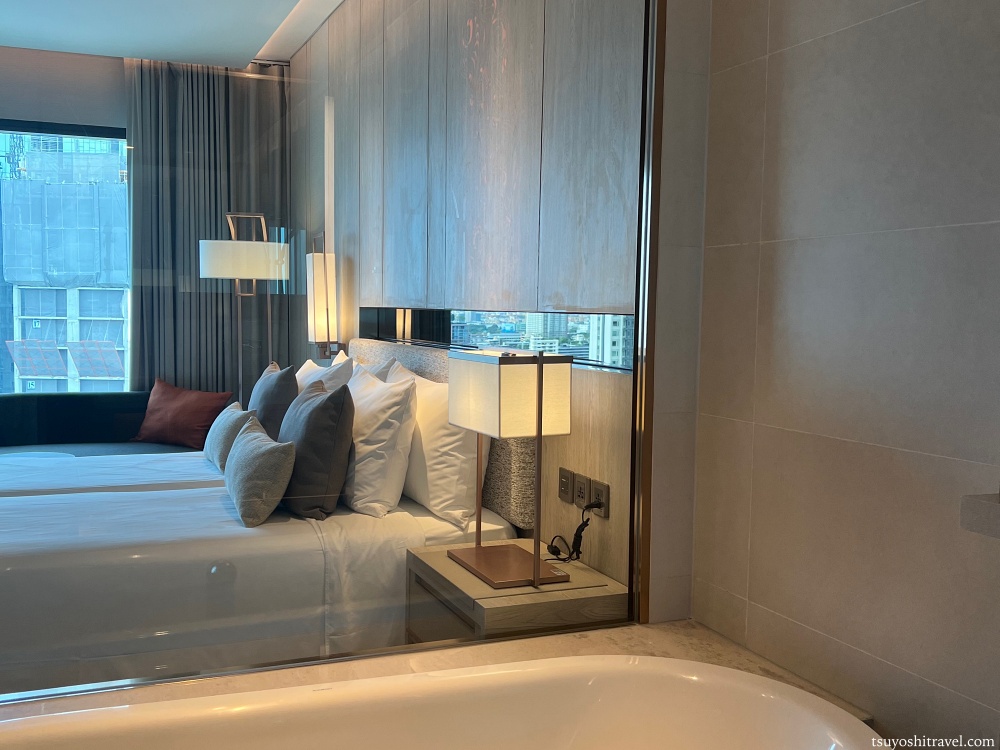 海外のホテルにはありがちだが、ベッドルームとバスルームがガラス張りになっている。