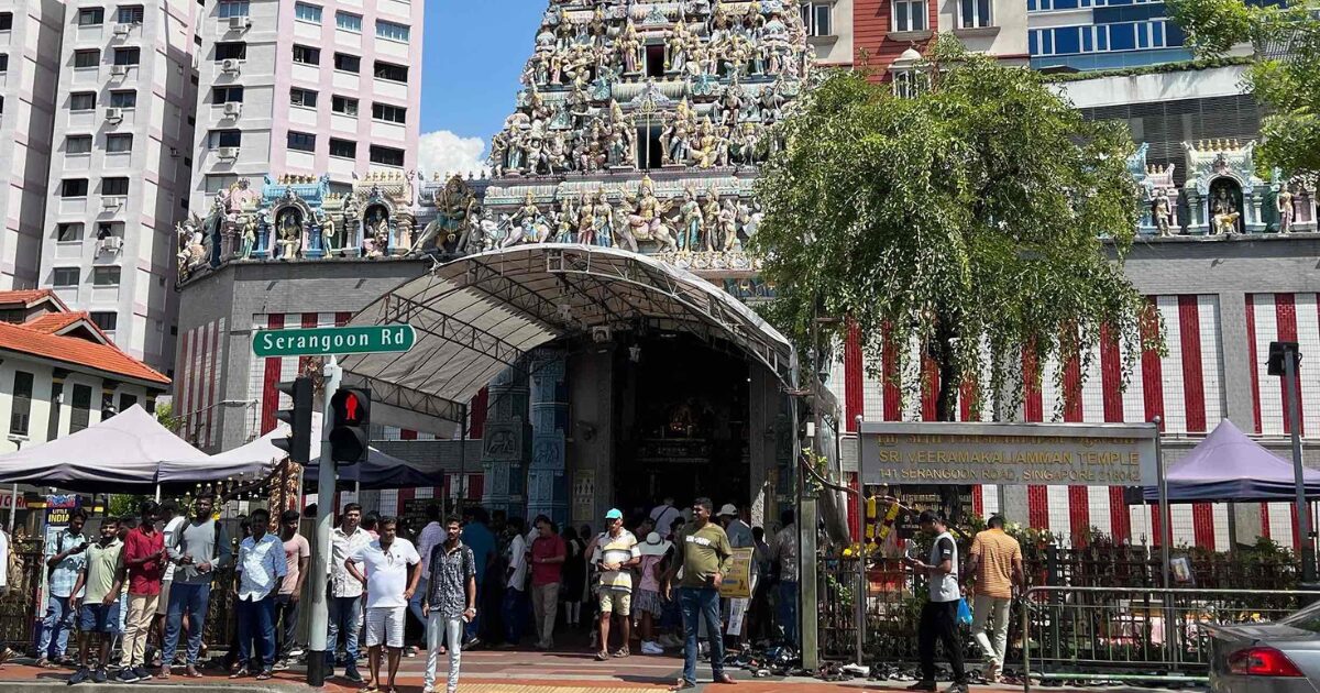 道路の反対側からスリ・ヴィラマカリアマン寺院を見てみると、正面にいる人のほとんどがインド系住民のように見える。