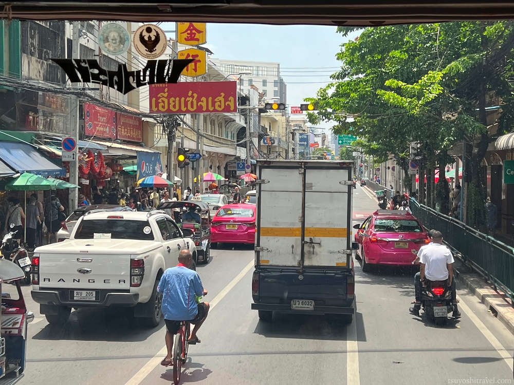 バスの車内からバンコクの人々の暮らしや街並みを望むことができる。