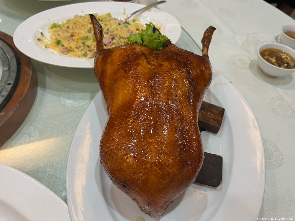こちらが「北京ダック」で、味付けした鴨(アヒル)をまるごと焼き上げる、中華料理の代表的な料理である。