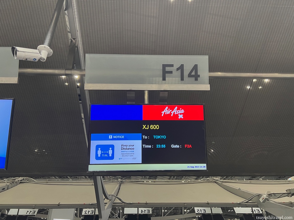 フライトボードの右側上段から8番目に搭乗予定の23:55発 エアアジアX XJ600便の記載がある。