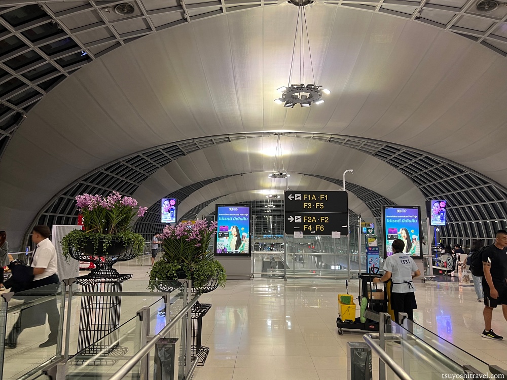 スワンナプーム空港の搭乗ゲートはかなり特徴的な作りで、どこか海外の鉄道駅にありそうな雰囲気がある。
