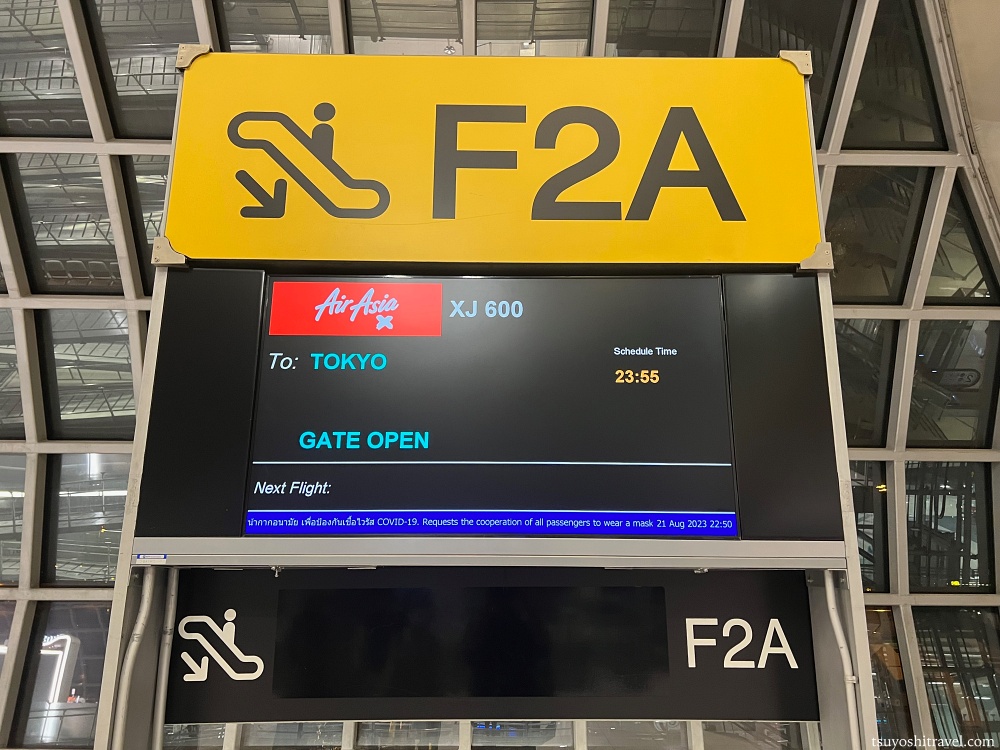 さらにフライトボードの右端を見てみると搭乗口までの時間も記載されており、今回の便はF2Aゲートが搭乗口で、歩いて11分と表示されている。
