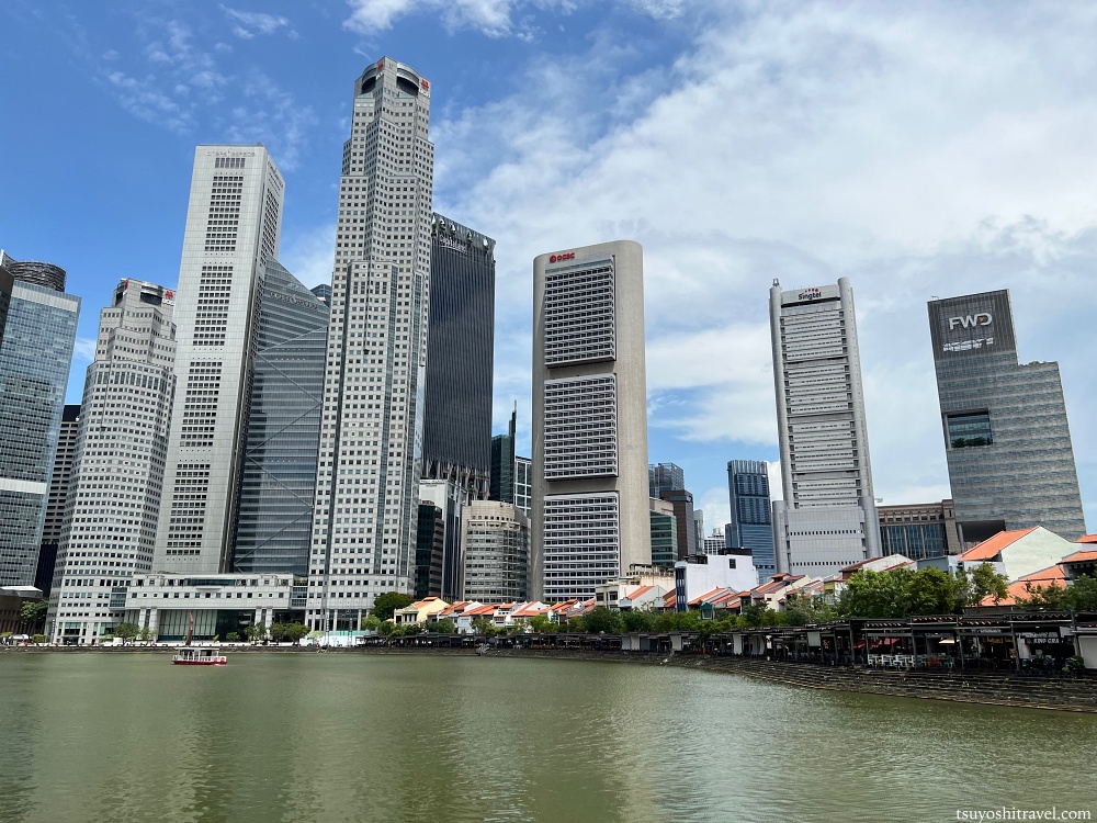 高層ビル群が乱立しているところがシンガポール川の対岸のエリアのボートキー(Boat Quay)である。