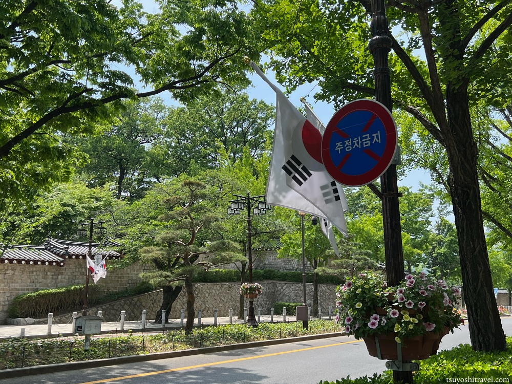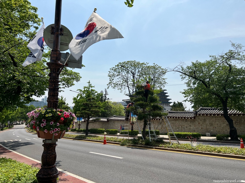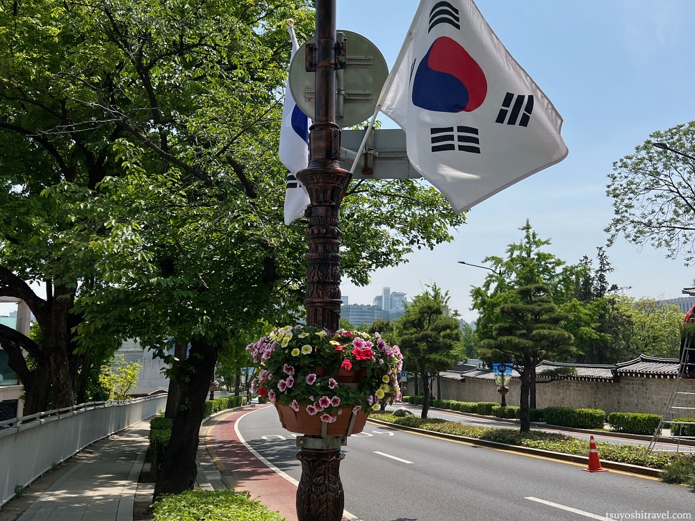 景福宮から大統領府に向かう途中には太極旗が多く飾られ、綺麗なプランターの花も設置されている。