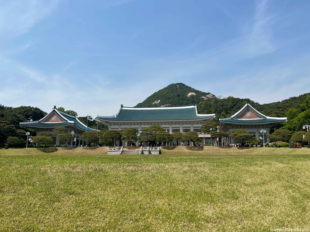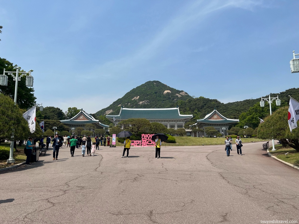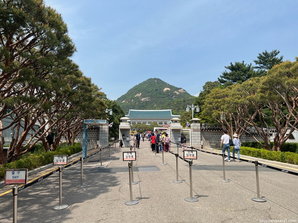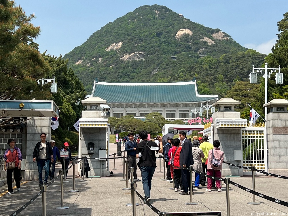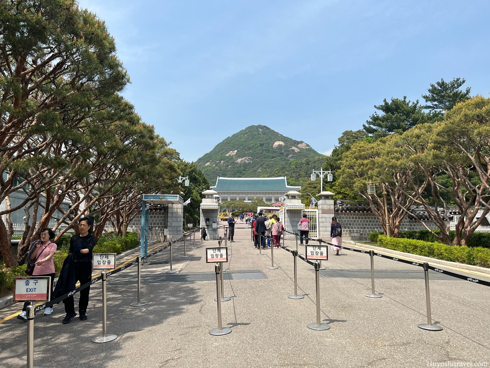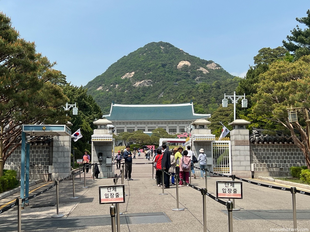 入り口付近からは、景福宮や光化門広場からも見えていた、白岳山(ペガクサン)をバックに青瓦台の堂々たる姿を見ることができた