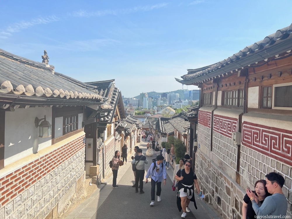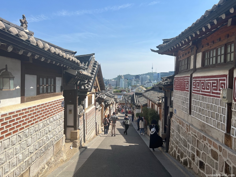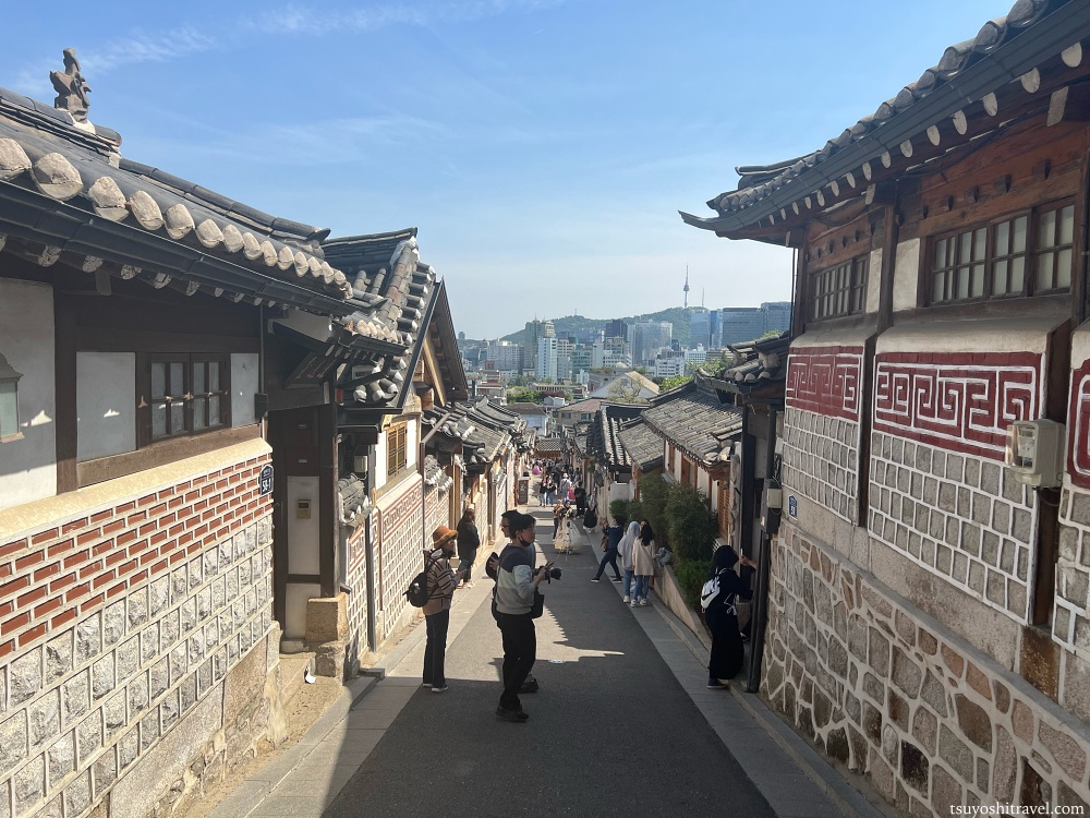 韓屋街は急坂になっており、その上部まで登ると韓屋街とともにソウルの街並みが一望できるようになっている。