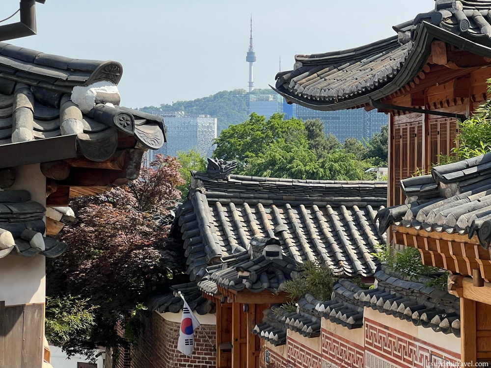 太極旗や韓屋街、Nソウルタワー、近代的なソウルの高層ビル群と「韓国」を象徴する景観を一枚の写真に合わせて撮影することができた。