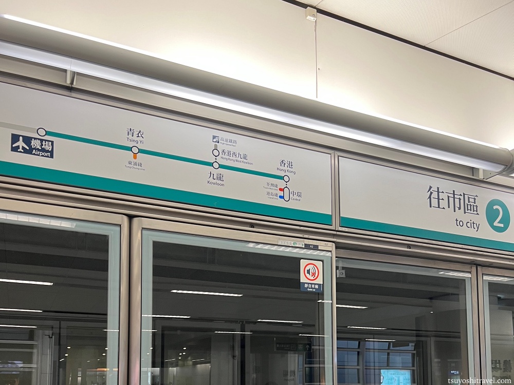 香港国際空港に隣接する機場駅(ケイツン駅)出発後は、青衣駅(ツェンイー駅)、九龍駅(カオルーン駅)に停車し、そのまま終点まで乗車していると香港島の香港駅まで移動することができるので非常に便利である。