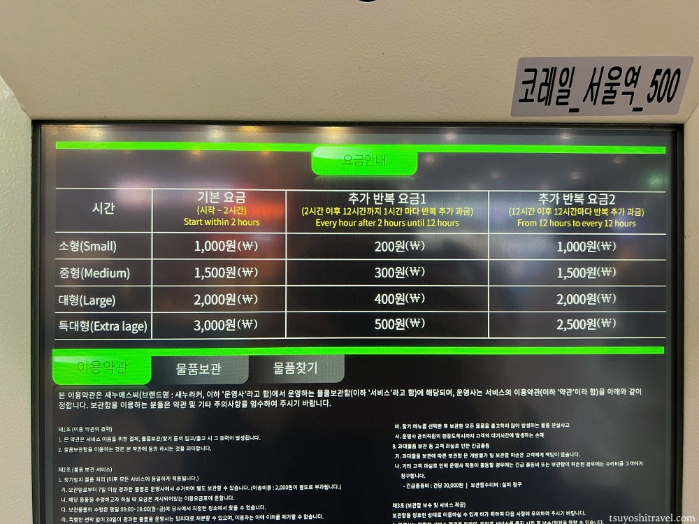 私が荷物を預けたスモールサイズのロッカーでは2時間までは1000ウォン、2時間〜12時間までは1時間毎に200ウォン、12時間以降は12時間毎に1000ウォンという料金体系だった。