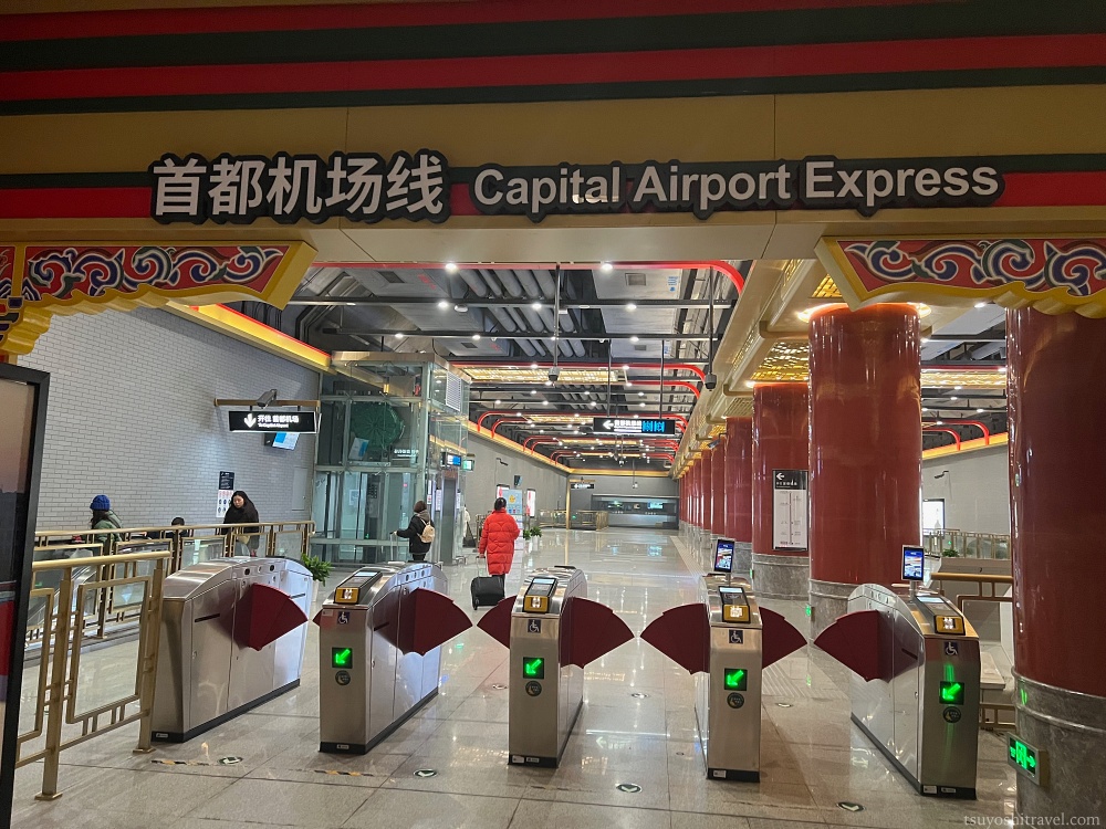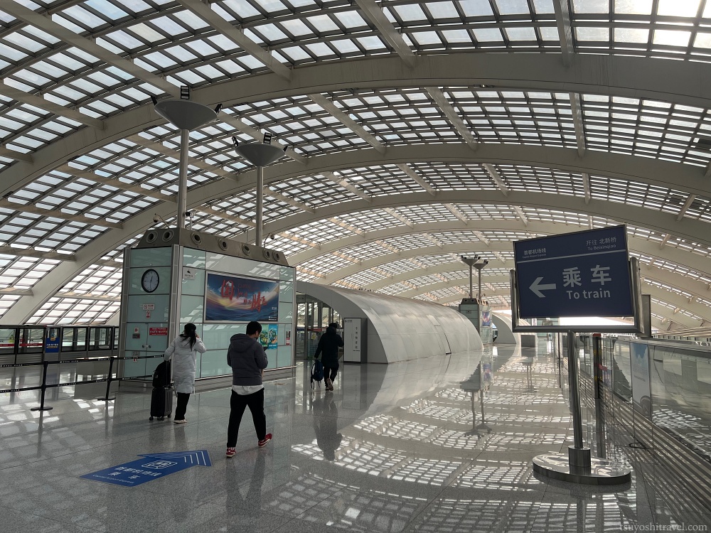 空港の入国審査を終えて、到着エリアに出てくると首都機上線の案内板が出てくるので、それに従って歩いていくと北京首都国際空港第3ターミナル駅に到着する。