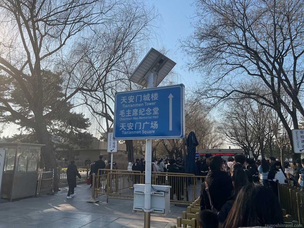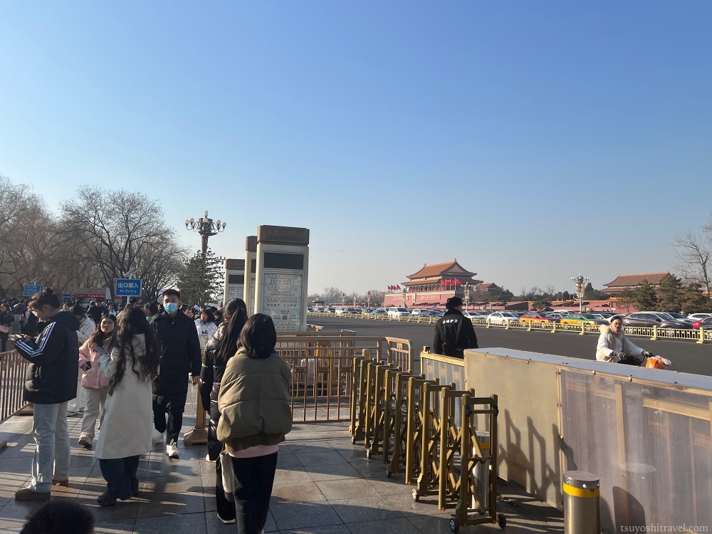 手荷物検査の待機列からは奥の方にすでに「天安門城楼(The Tiananmen Gate Tower)」の姿が見えてきた。
