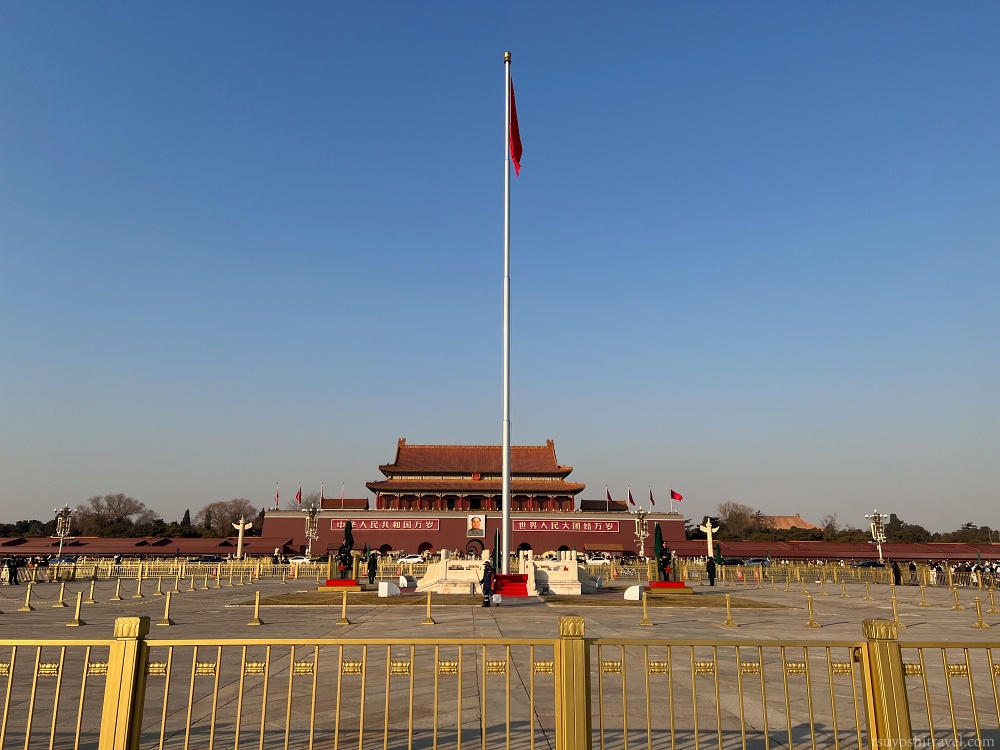 天安門広場の中央部からは国旗掲揚台と天安門城楼の姿を望むことができる。