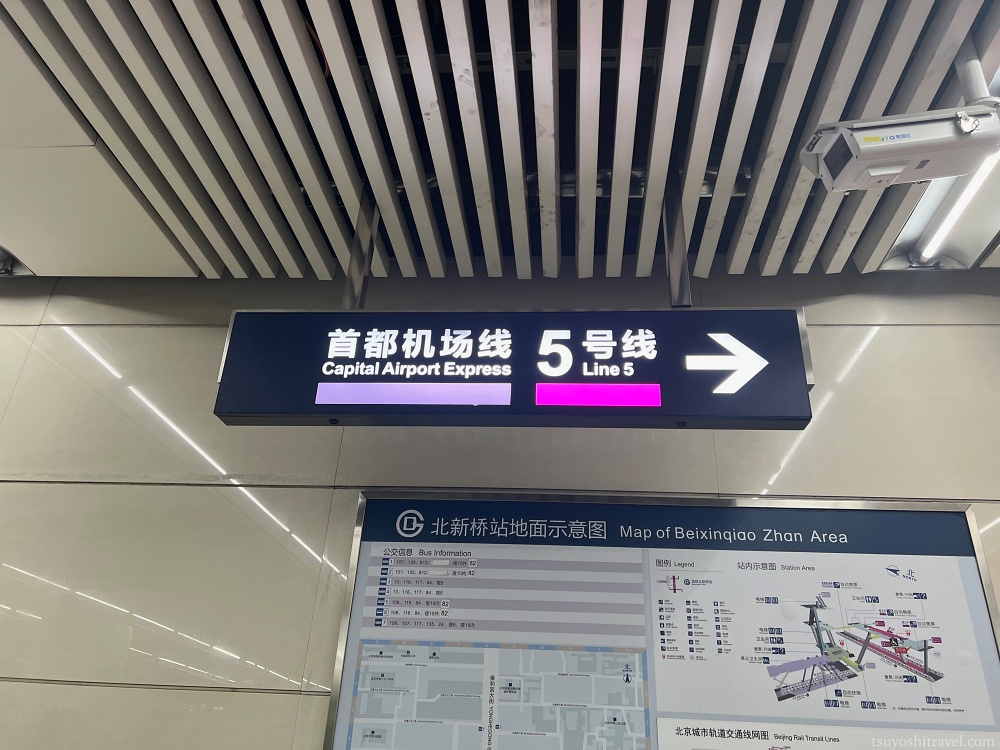 地下鉄5号線の北新橋駅で乗り換えて、北京地下鉄首都機上線に乗車する。