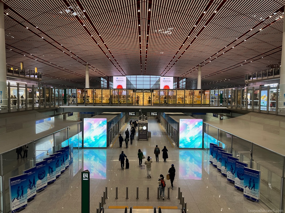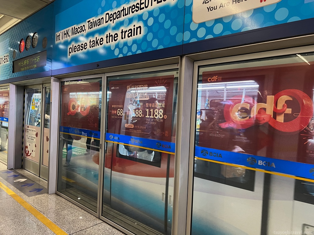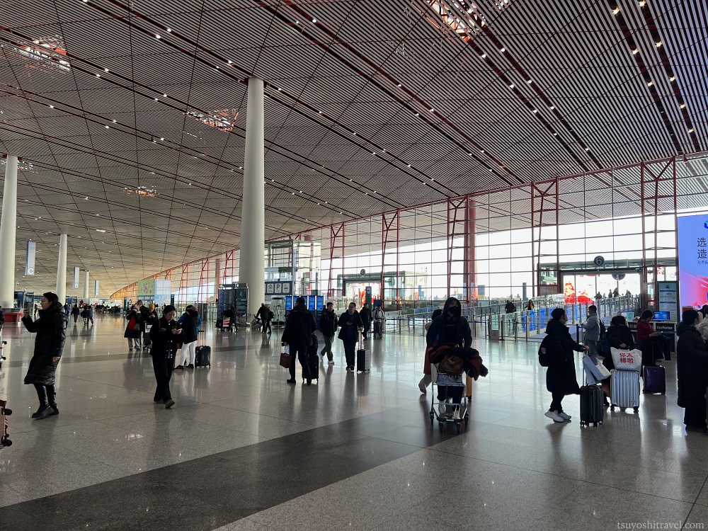 北京首都国際空港の第3ターミナルは少し複雑な構造をしていて、第3ターミナルのCエリアで手荷物検査を受けた後に、シャトルトレインという空港内を移動するための列車に乗車して、出国審査場および出国ゲートまで移動するシステムとなっている。