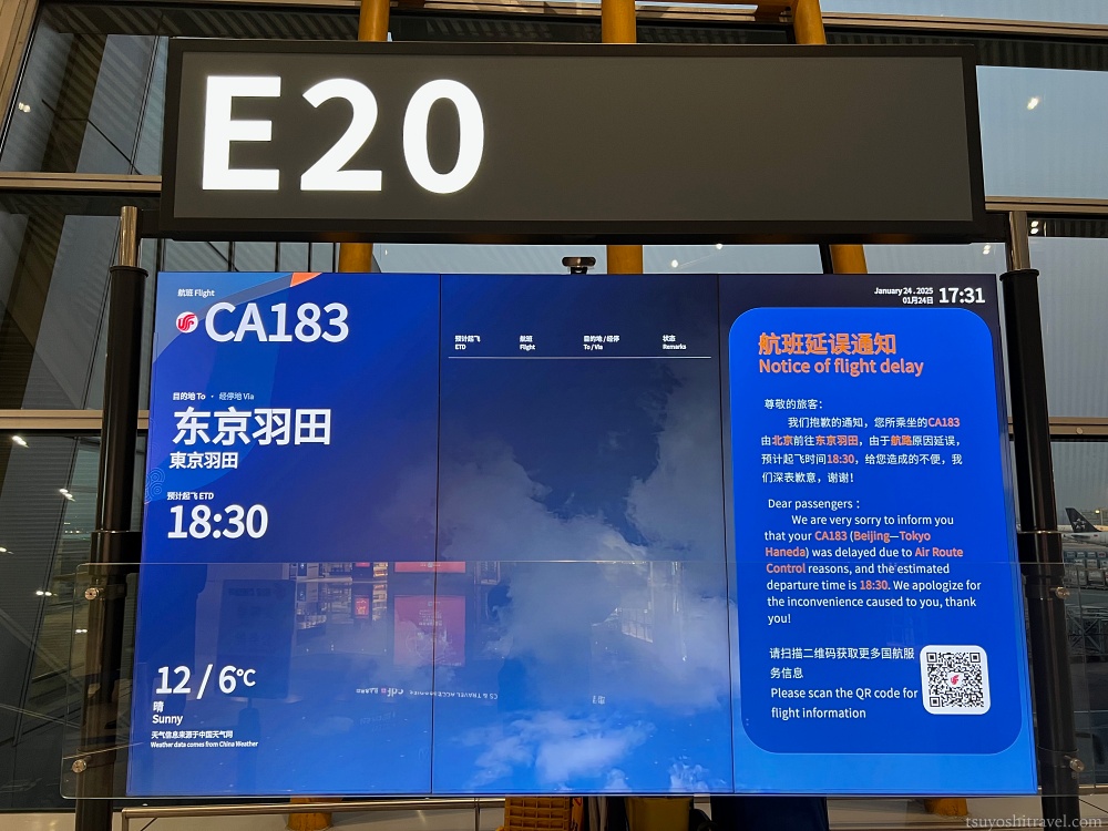 北京首都国際空港でチェックインしたが1時間の遅延が発生