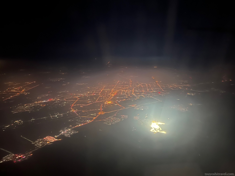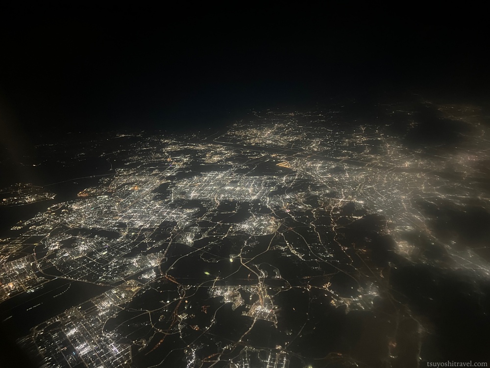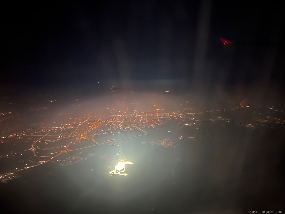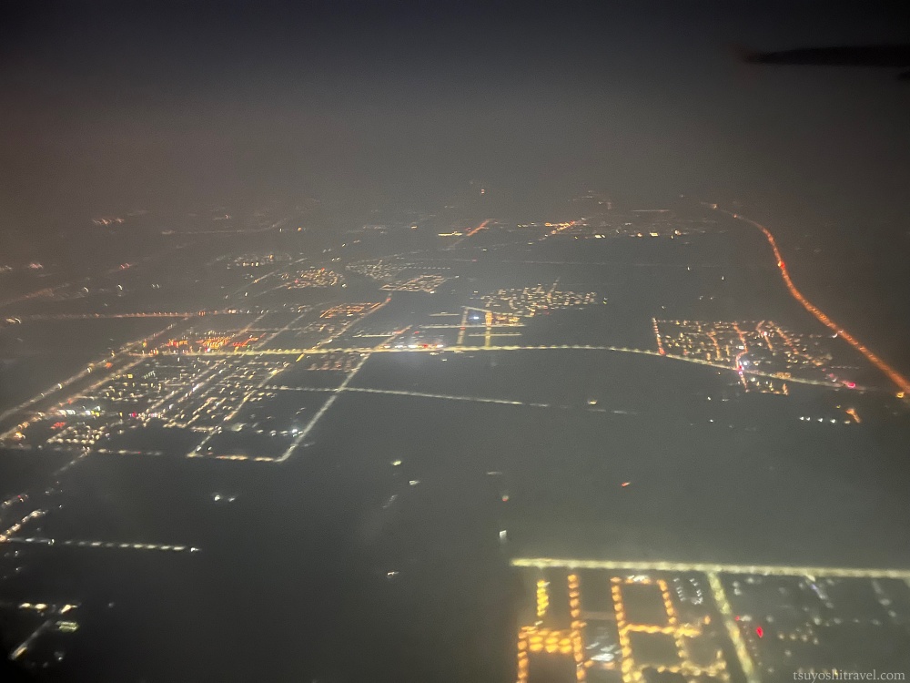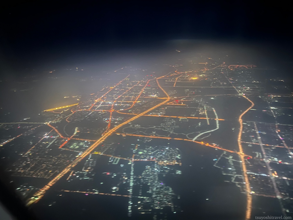 大気汚染の影響があるのか、モヤがかかっているが、高度が上がるにつれて徐々に夜景が見えてきた。